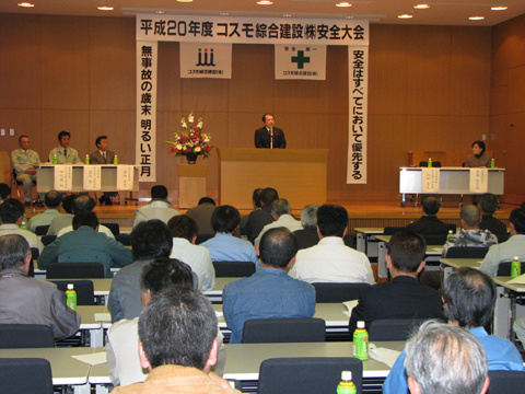 コスモ綜合建設㈱(水戸市けやき台2-13-2、池田勇夫代表取締役)の安全協力会と勇交会(澤畑寿秀会長)は9日、平成20年度安全衛生大会を同市笠原町の県市町村会館で社員、協力会社メンバーら総勢220人を集め盛大に開催した。池田社長は「安全と企業の繁栄は両輪。安全が欠けたら繁栄は成り立たない」と、年末に多発する事故の未然防止に向けた各社への協力を要請。参加者全員でゼロ災害の永続的な達成を誓い合った。