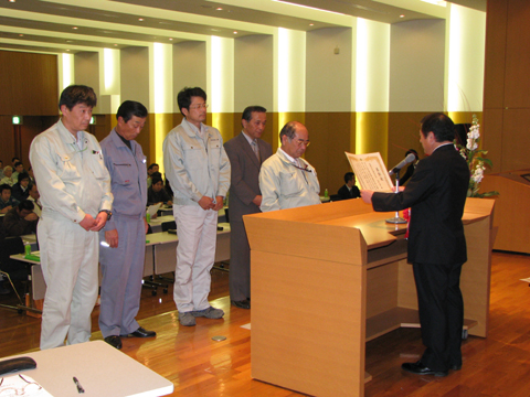 その後は、優良者安全表彰に移り、池田社長が自社の池田光男取締役住宅開発室長、武藤浩建築一課長の2人と、協力会社の㈲下條鉄筋工業、㈱那波屋工業、㈲柳下タイル店の3社代表にそれぞれ賞状と記念品を手渡した。