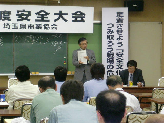 埼玉県電業協会は16日、平成21年度安全大会を建産連研修センターで開催した。冒頭、島村光正副会長が「存在感のある協会運営をするためには、まず、自分を守る、家族を守る、会社を守るという安全意識の高揚が大事」であるとし、「本日の安全大会で学んだことを日々の業務の中で実践してほしい」とあいさつした。