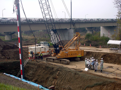 打設式では行政機関の職員や地元住民らが見守る中、紅白に化粧した最後の鋼矢板を地中に打ち込み、地域の悲願であった工事の節目を祝った。