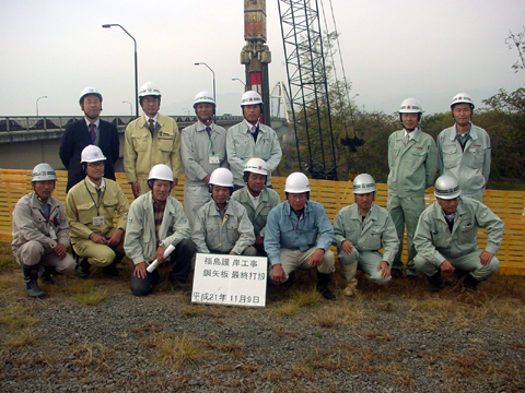 国土交通省千曲川河川事務所所管事業として平成18年度から進められてきた福島護岸工事(須坂市福島)で9日、矢板の最終打設式が行われた。