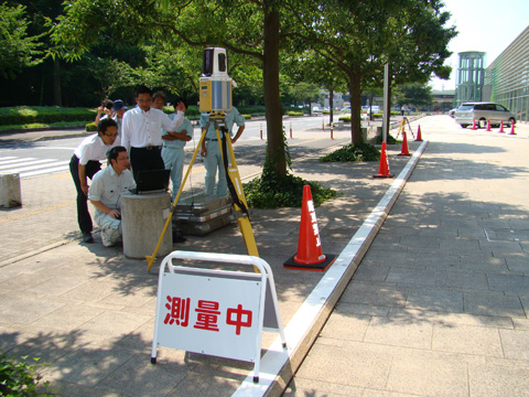 当日は午前中に座学による研修会を行い、午後には開発公社ビル前の石畳を実測。路面形状をスキャニングした点群データを取り込み、実際にパソコンで操作した。