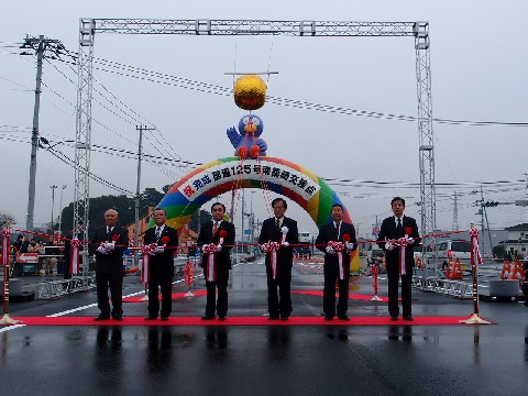 行田県土整備事務所は17日、国道125号線南篠崎交差点の完成式典を開催。上田知事などによるテープカット、くす球開披、祝賀パレードが行われた。