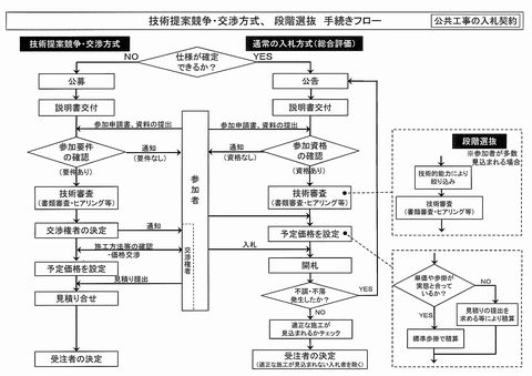 公募して参加要件の確認を行った後、技術審査(書類審査・ヒアリング)でまず交渉権者を決定。施工方法を確認すると共に価格交渉し、予定価格を設定する。その後に交渉権者と見積り合せをして、契約を締結する。