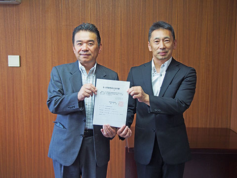 13日に松本市開智の松本市建設業会館で、中小企業団体中央会中信事務所の馬場智也所長から証明書を受け取った深澤理事長は「協同組合の受注環境を拡げるために何をすればいいか考えた時、中央会からもご指導いただきながら官公需適格組合の取得へ向けてスタートした。規約を変えたり大変なこともあったが、これから受注に向けて松本市役所とお話しさせていただきながら、組合員の仕事を確保していきたい」との考えを示した。