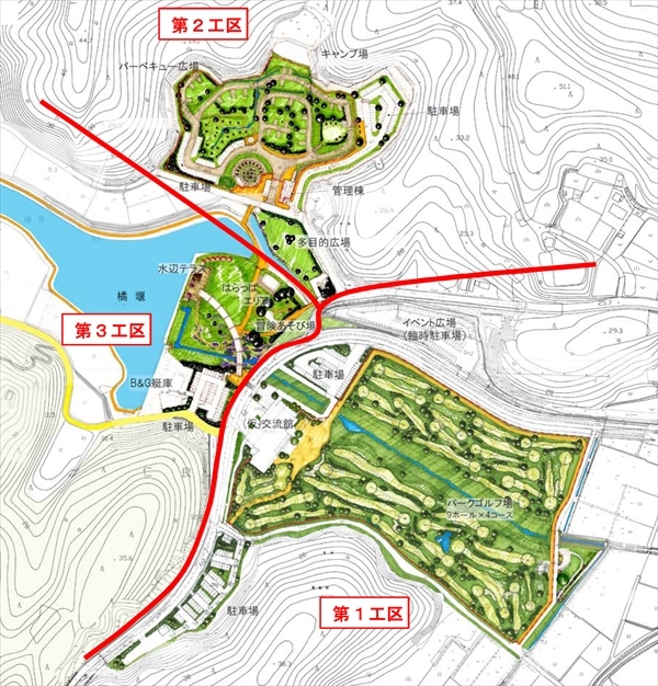 公園の全体面積は約10・6ha。これを第1~第3工区に分けて整備。第1工区には体験学習施設、36ホールのパークゴルフ場、イベント広場など、第2工区にはキャンプ場、バーベキュー広場、管理棟、多目的広場など、第3工区には冒険あそび場、水辺テラスなどを計画する。