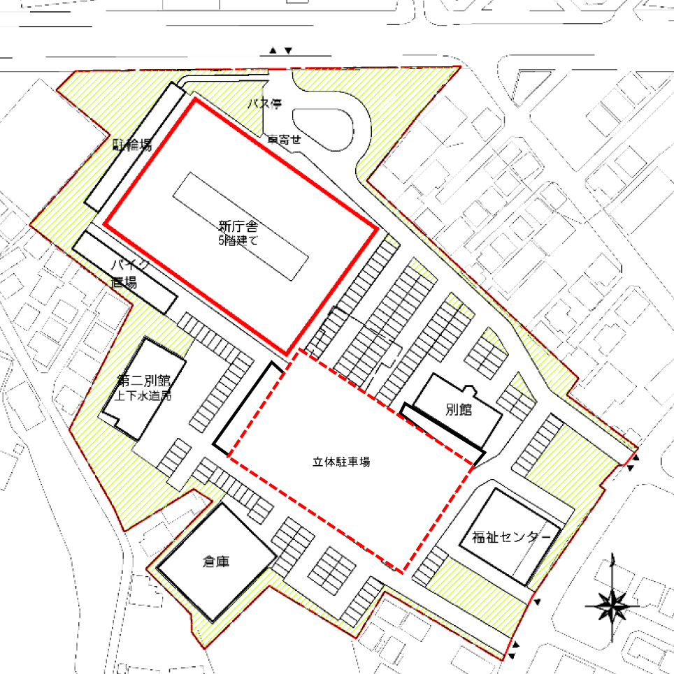 新庁舎の建設場所は既存庁舎(大和田新田312-5)敷地内で、敷地面積は2万5153㎡、都市計画用途地域は第2種住居地域(建ぺい率60%、容積率200%)、第2種高度地区(最高高さ20m)。