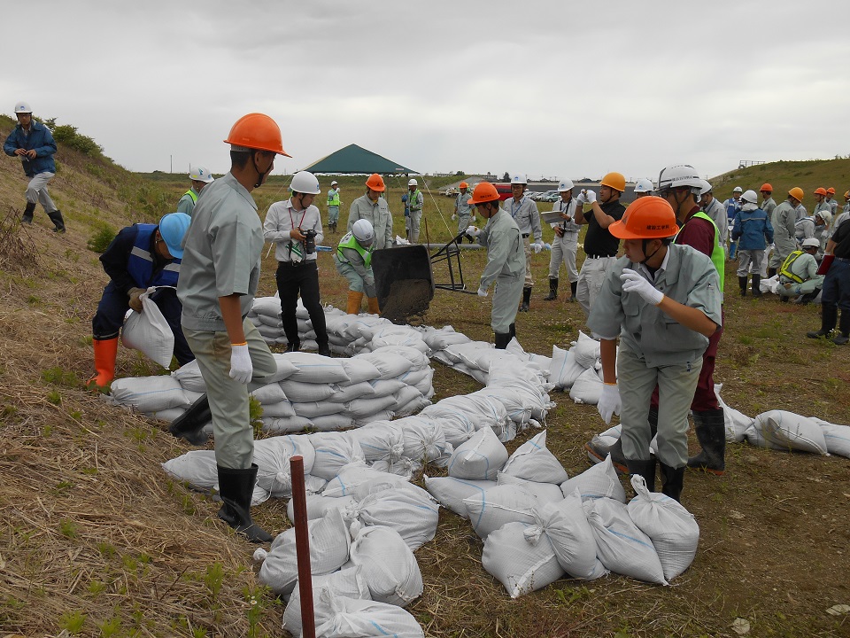 三条市月岡の五十嵐川遊水地には県建設業協会三条支部、三条市建設業協会青年部の会員を含む60人の参加者が集合。最初に県三条地域整備部の諏佐夏夫部長が「本日は月の輪工を経験してもらって評価して欲しい。命を守る使命を感じ、将来は水防団に参加してもらいたい」と生徒を激励した。