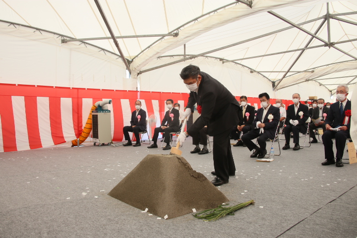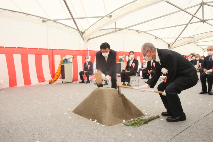 施工を担当する水倉組の水倉直人代表取締役は「賑わい、地域の拠点整備に携わることは光栄であり、期待に身が引き締まる思い。技術力を遺憾なく発揮し、協力会社とともに誠心誠意努めたい」と決意を述べた。