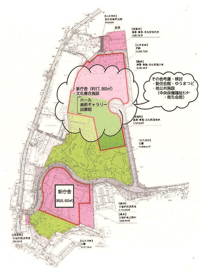第1ステップとして、32年度をめどに新拠点ゾーン南側の国有地8745㎡に延べ床面積約2万㎡の南側新庁舎を建設し、現本館と現新館の機能を移転する。各階の床面積は約2000㎡を想定。一定の耐震性が確保されている議会棟と別館は使用を継続する。