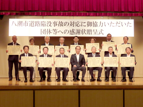 今年1月28日に八潮市内で発生した道路陥没事故の対応に協力した団体、企業等への県からの感謝状贈呈式が27日、さいたま市内のコルソホールで開かれ、復旧協力団体13団体(別表)と寄付企業1社(コンストラクションヤマザキ)には大野元裕知事から、事業者75社には○○下水道事業管理者から感謝状が手渡された。