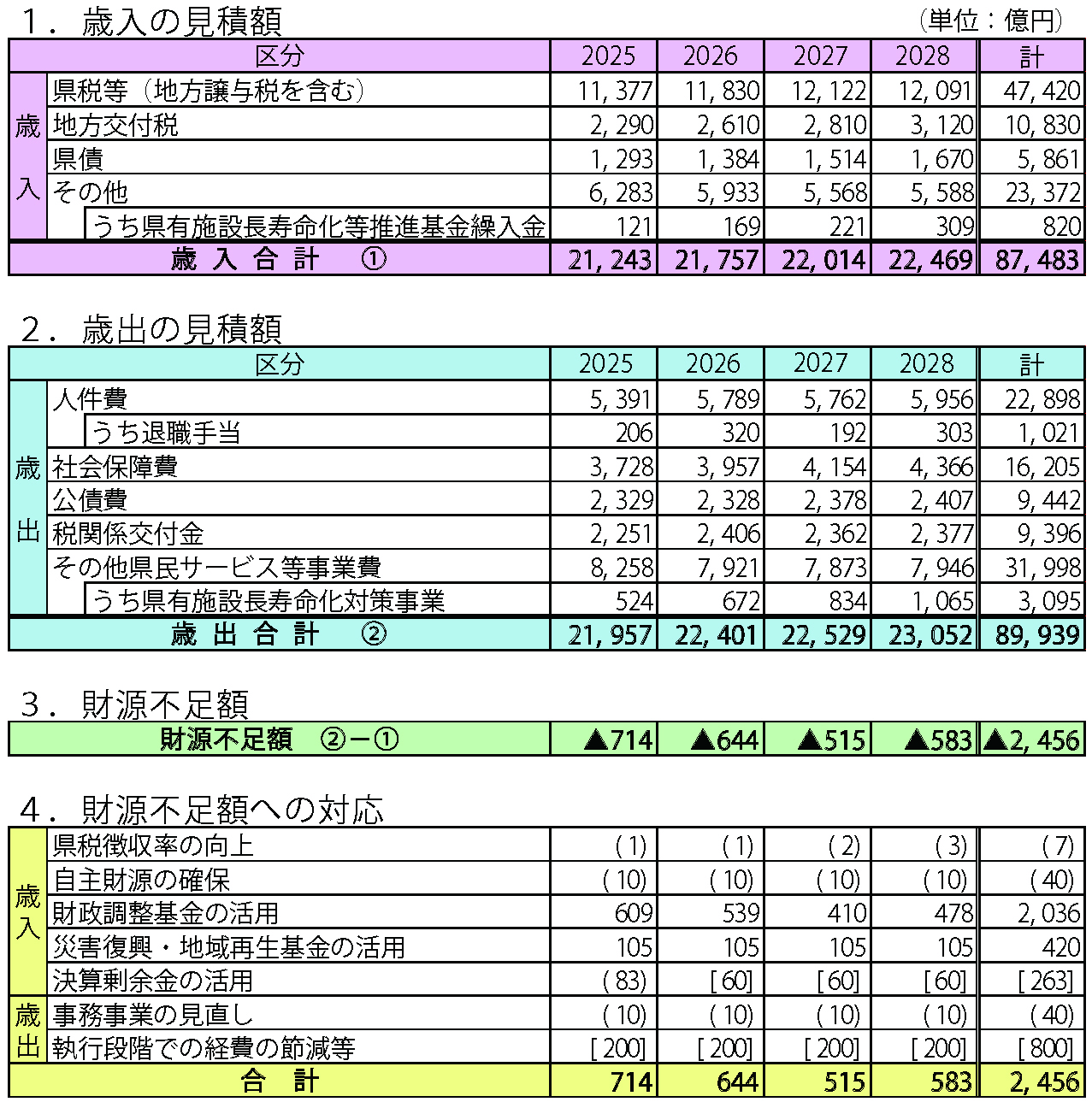 計画期間中の、一般会計ベースの歳入・歳出の見通しを参考として示した。歳出のうち、「その他県民サービス等事業費」は、25年度8258億円(うち、県有施設長寿命化対策事業524億円)、26年度7921億円(同672億円)、27年度7873億円(同834億円)、28年度7946億円(同1065億円)の見込み。