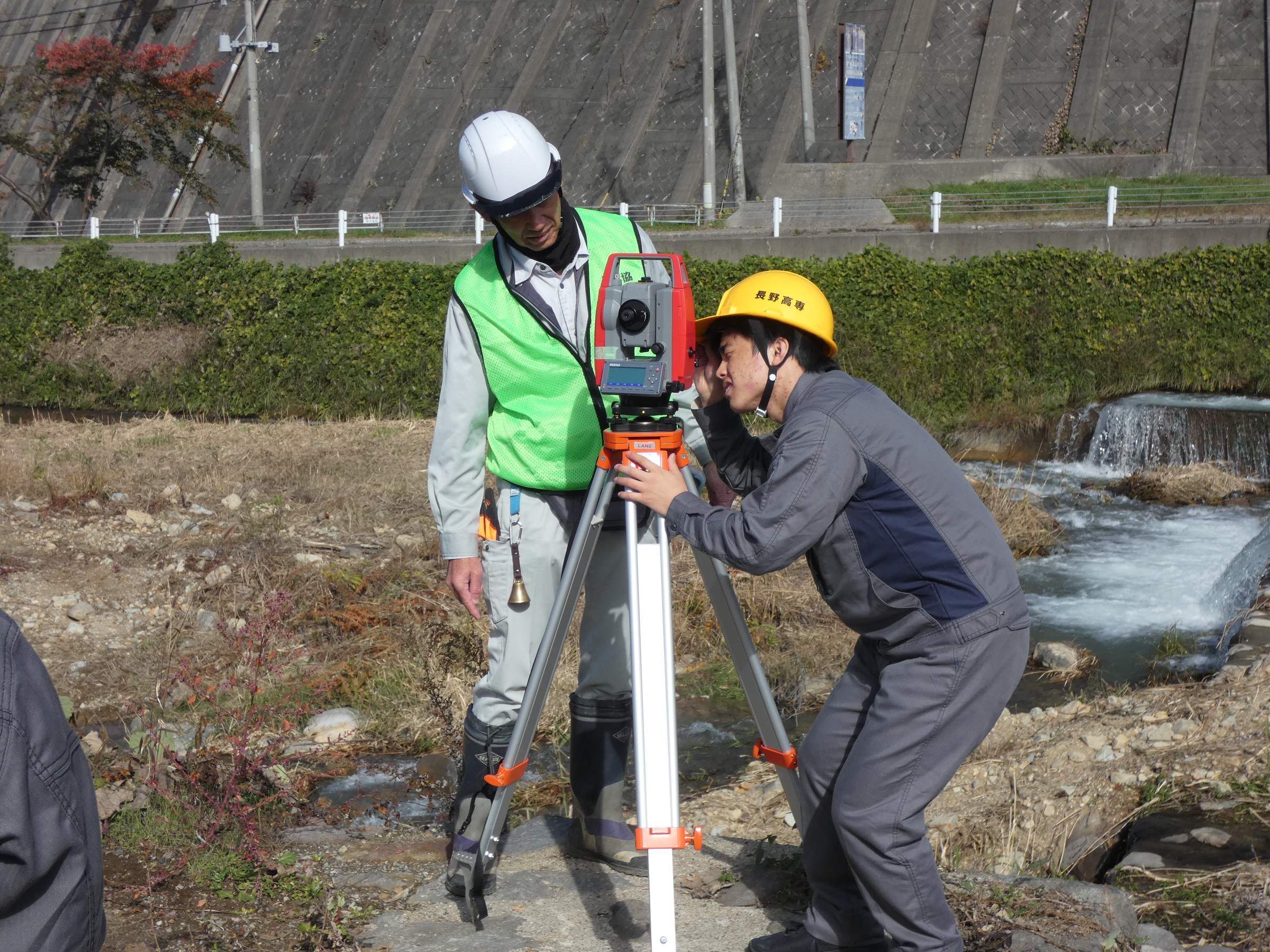 県測量設計業協会(吉竹行仁会長)は6日、国立長野工業高等専門学校の学生を対象とした測量実習を山ノ内町のやまびこ公園周辺で行った。一級河川夜間瀬川を題材に、会員たちが調査技術を直接指導した。