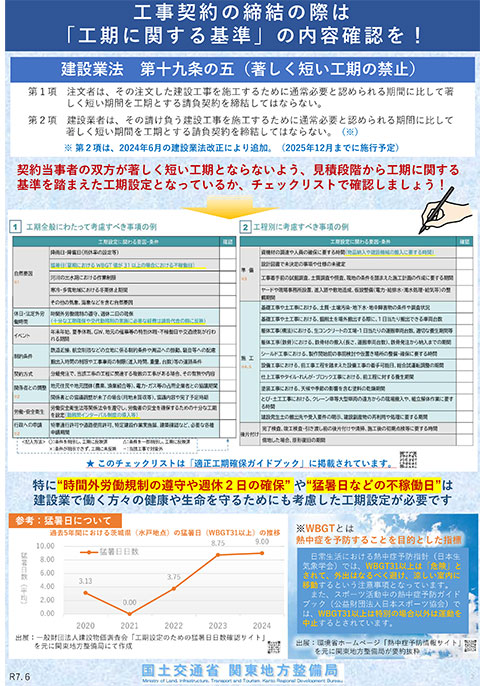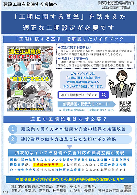 今後の取り組みとして関東地方整備局管内の建設業許可部局で作成した「発注者向け適正工期周知のチラシ」、関東地方整備局・関東甲信越の建設業団体、都県政令市が実行していく内容をまとめた「働き方改革の周知チラシ」を活用しながら関係団体等が、取り組みを行っていく。