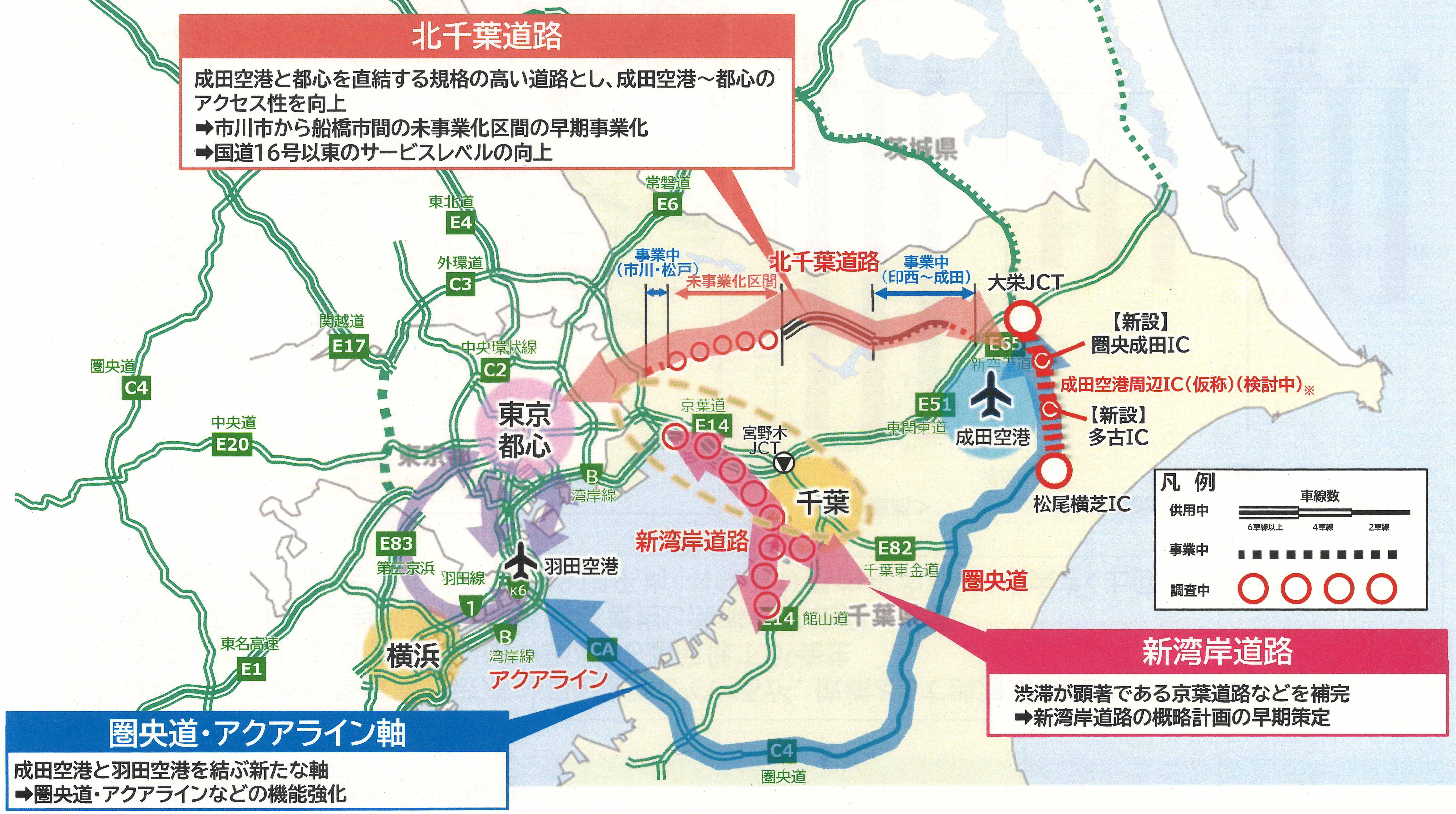 基本方針案では▽成田と都心・羽田の連結強化につながる新たなネットワーク形成▽圏央道・アクアライン軸(ゲートウェイ・コリドー)の強化▽高規格道路アクセスの改善▽ネットワークを賢く利用する取り組み――を挙げた。