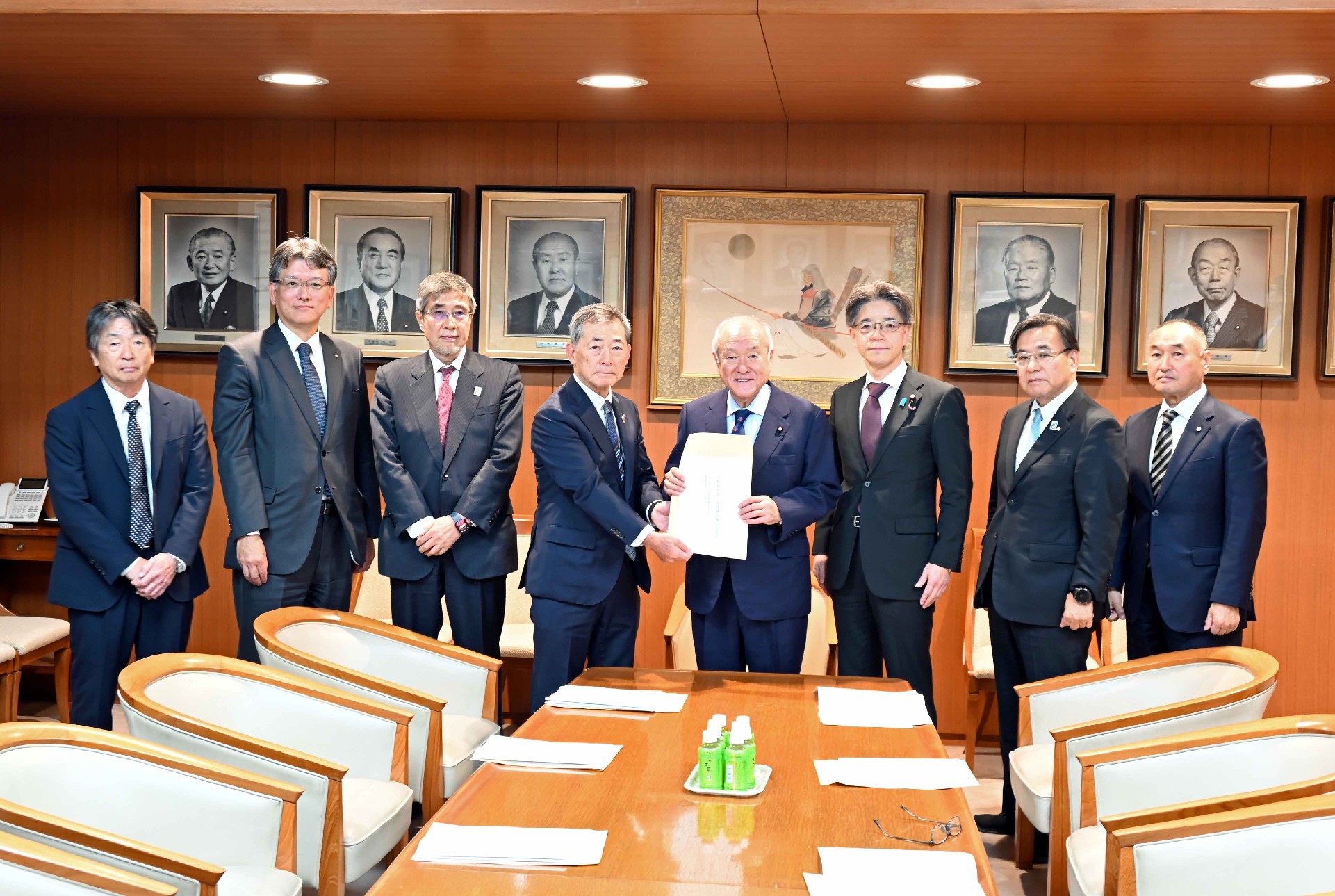 要望は、全国9ブロックの地域懇談会・ブロック会議の意見を総意として取りまとめたもの。公共事業費の確保や直近の実勢価格を予定価格に適切に反映することなどを盛り込んでいる。鈴木幹事長には岩手県建設業協会の向井田岳会長、梶山国対委員長には茨城県建設業協会の石津健光会長が同行した。