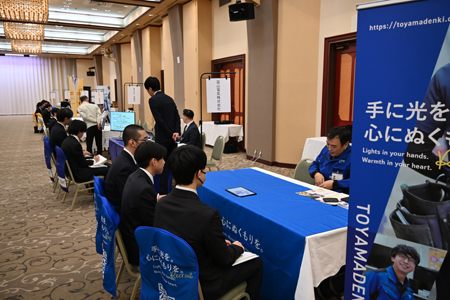 新潟県電気工事工業組合(吉田徳治理事長)は21日、県内専門学校や新潟テクノスクールと連携し、電気工事業界に特化した学生との「合同企業説明会」を開催した。会場となった新潟東映ホテル(新潟市中央区)には県内の企業15社がブースを構え、電気工事関係の資格取得へ向けて各学校で学んでいる30人の学生が参加した。