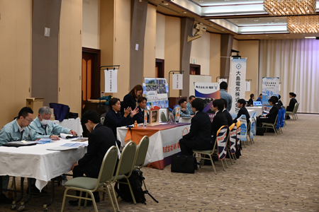 学生たちは各企業のブースにおいて、電気工事業の仕事内容や会社の概要、働き方、魅力などの説明を受けるとともに、将来の就職活動の参考になるよう仕事に就いた動機、やりがい、給与・休暇などを聞き、情報収集を図った。