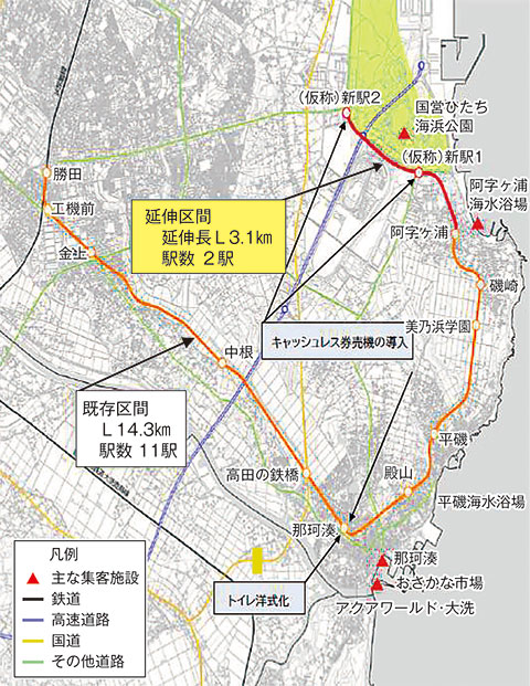 主な取り組み内容として、国営ひたち海浜公園西口付近への延伸をはじめ、キャッシュレス券売機の導入、トイレ洋式化などを行う。また、運行と施設の維持管理を分ける「みなし上下分離方式」ヘの事業構造変更のほか、既存鉄道施設等の設備更新および維持修繕に要する費用、延伸など利便性工事に係る整備費の負担などを盛り込んだ。