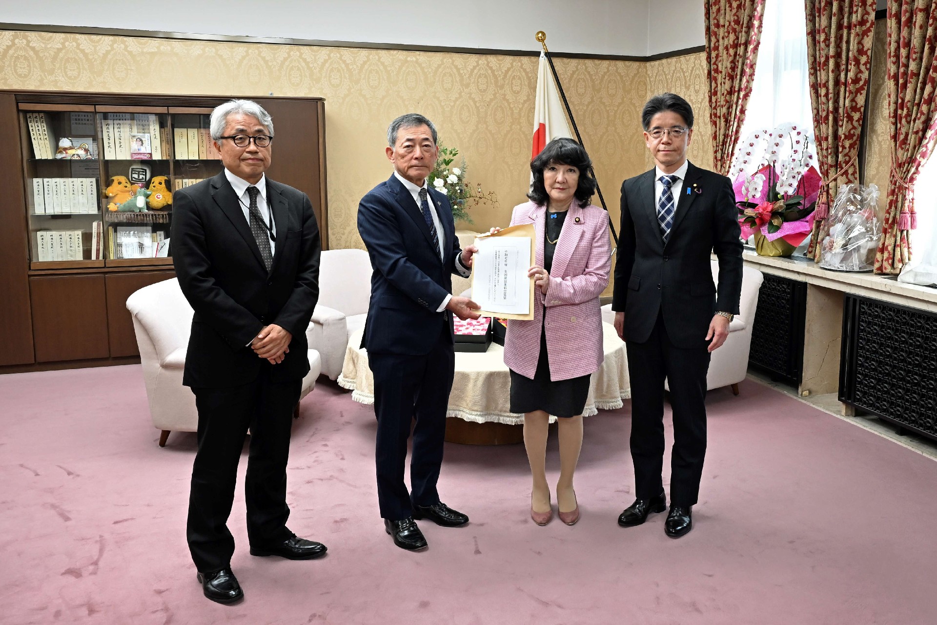 全国建設業協会(全建)の今井雅則会長、山崎篤男専務理事、石田信夫常務理事は11月26日、片山さつき財務相に公共事業予算の確保などに関する緊急要望を行った。地域建設業が魅力ある憧れの産業として社会的使命を果たしていけるよう2項目を求めた。要望には見坂茂範参議院議員も同行した。