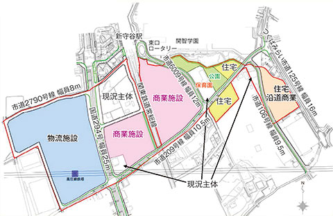 事業区域内の約14・6haが市街化区域に編入され、工業専用地域や準住居地域、第一種・第二種住居地域の用途地域を設定。さらに地区計画において、工業・沿道商業・商業・住宅・沿道複合の5つのゾーンに区分する。