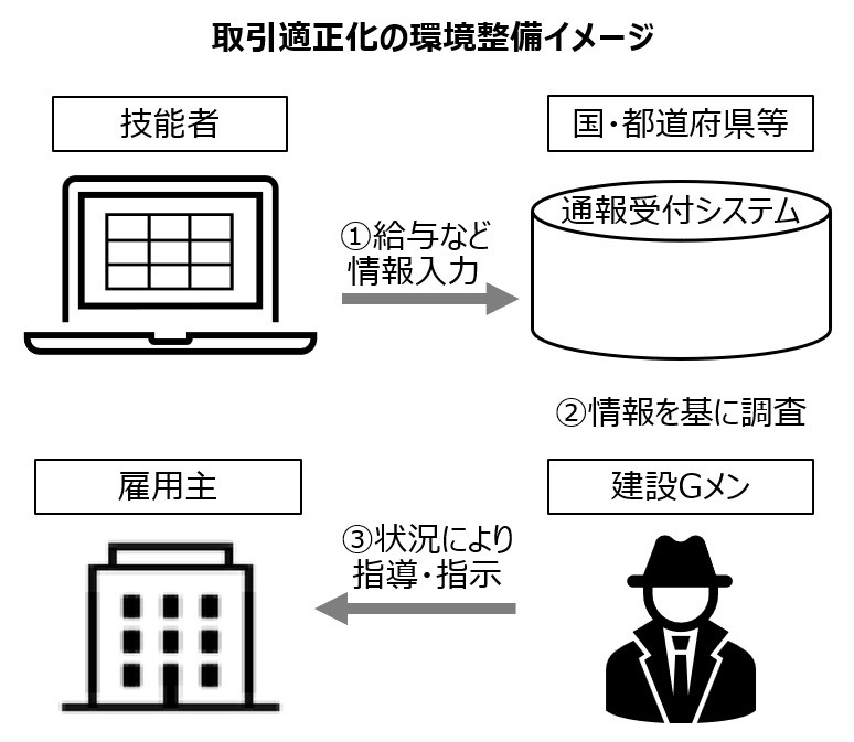 国土交通省は、技能者への賃金が適正に支払われるよう、取引適正化を促進するための体制整備に向けた調査・検討を行う。取り組みの方向性としては、技能者自身が給与明細を基に情報を『通報受付システム』に入力して許可行政庁に相談、状況により建設Gメンが事業者を調査して是正指導を行うものとなる。