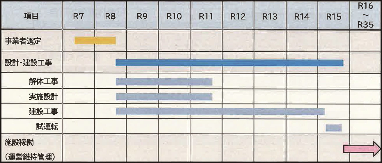 27年1月~33年度に実施設計、解体工事、建設工事を進め、34年度に稼働を開始する。運営維持管理期間は53年度まで。