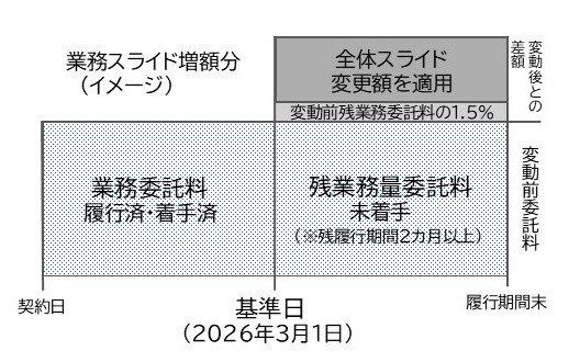 具体的な実施方法は、複数年度にまたがる直轄業務で、基準日(今回は設計業務委託等技術者単価が決定される26年3月1日を想定)以降未着手である『残業務量』の委託料について、新しい技術者単価を反映した変動額(差額分)のうち1・5%を超える部分について適用する。基準日以降に着手することが適切な項目で、基準日以前に着手していないことが明確に確認できるものについて協議を受け付ける。