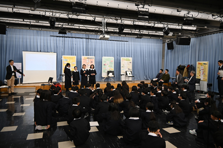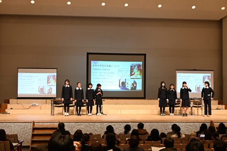 【写真=5年生によるポスターセッション、6年生による成果発表】