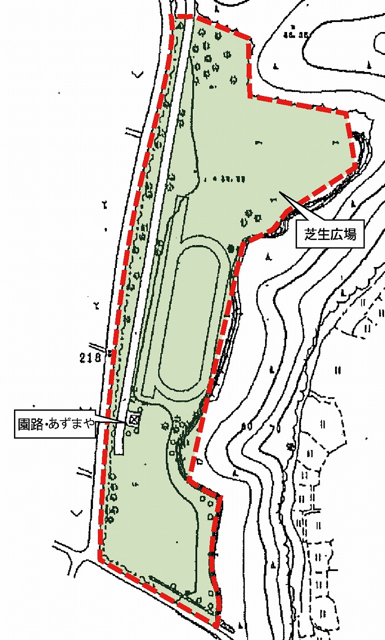 多目的広場は、芝生広場と園路で構成され、あずまやがある。