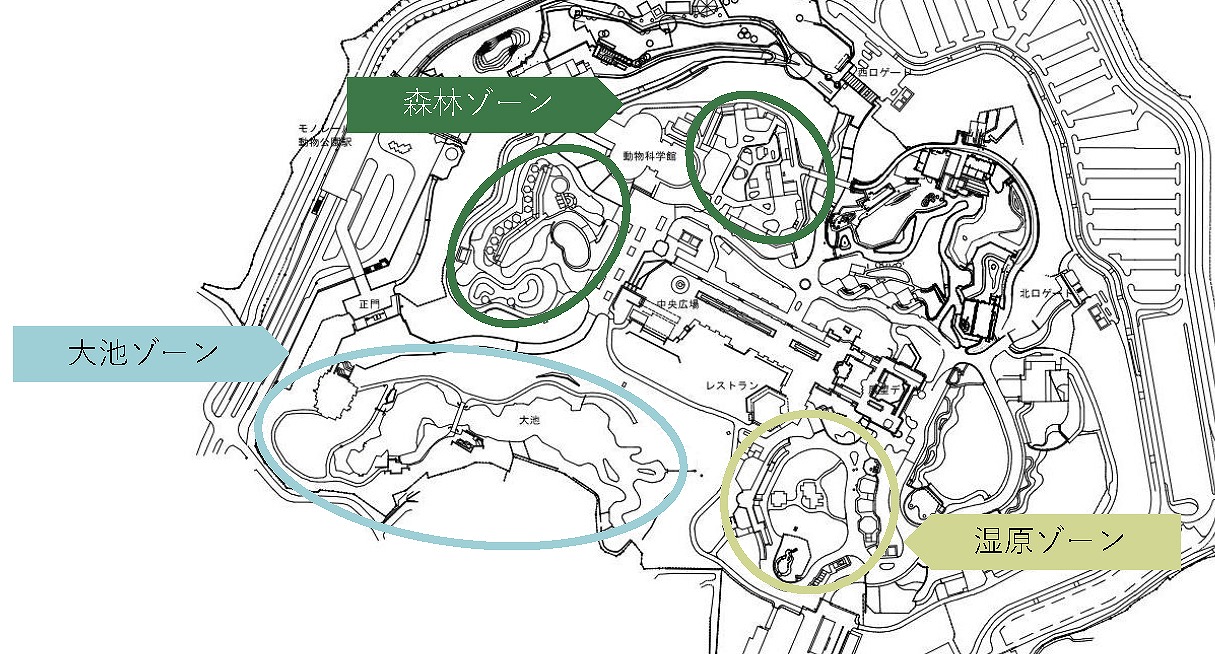 森林ゾーン・湿原ゾーンの整備方針は「『動物の暮らしを魅せる』展示空間の創出」。園の景観特性「プライベートスカイ」を生かした広々とした空を借景とし、動物の生息環境を再現することで、動物の暮らしや行動を学ぶ空間を創り出す。