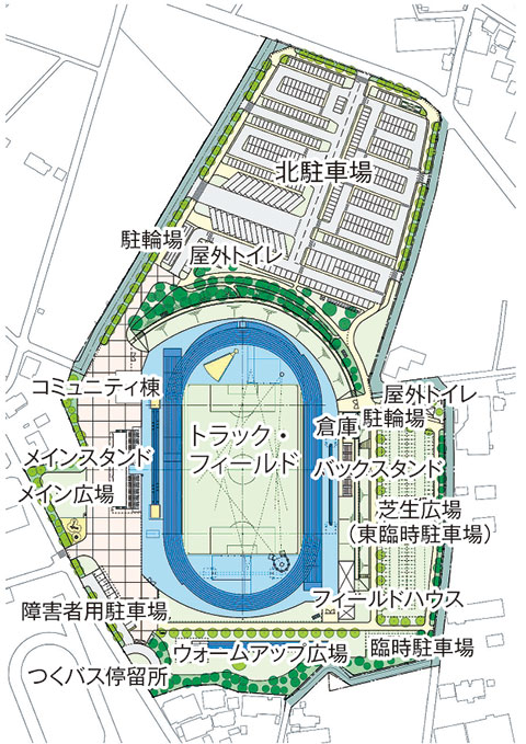 つくば市は(仮称)陸上競技場の基本設計において、基本計画から規模や配置等を変更した。メインスタンドを600席から400席に削減し、ウオームアップ広場を敷地南側に配置。環境機能やバリアフリー対応についても設計に盛り込んだ。概算工事費については33億6000万円から42億8967万円に上昇している。11月末までの旧上郷高校解体工事に合わせ、秋ごろの建設工事公告を見込む。2028年度中の供用に向け、整備を進めていく。