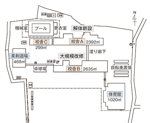 南側校舎については大規模改修を実施し、引き続き校舎として活用する計画だ。工事期間中はグラウンドに仮設校舎を設置し、教育活動を継続する。