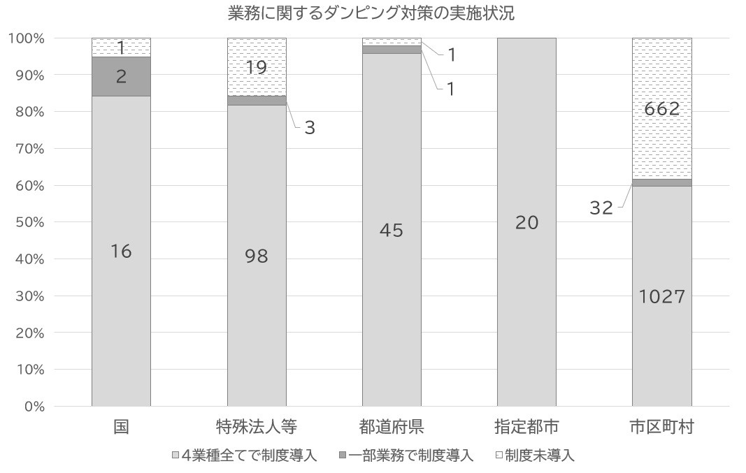 調査結果では、国は1機関でいずれの制度も未導入。特殊法人等は約2割の19団体で未導入だった。都道府県は1団体で未導入。指定都市は全団体がいずれかの制度を導入。市区町村は1027団体は4業種全てでいずれかの制度を導入、32団体は一部業種でいずれかの制度を導入、約4割となる662団体でいずれの制度も未導入だった。