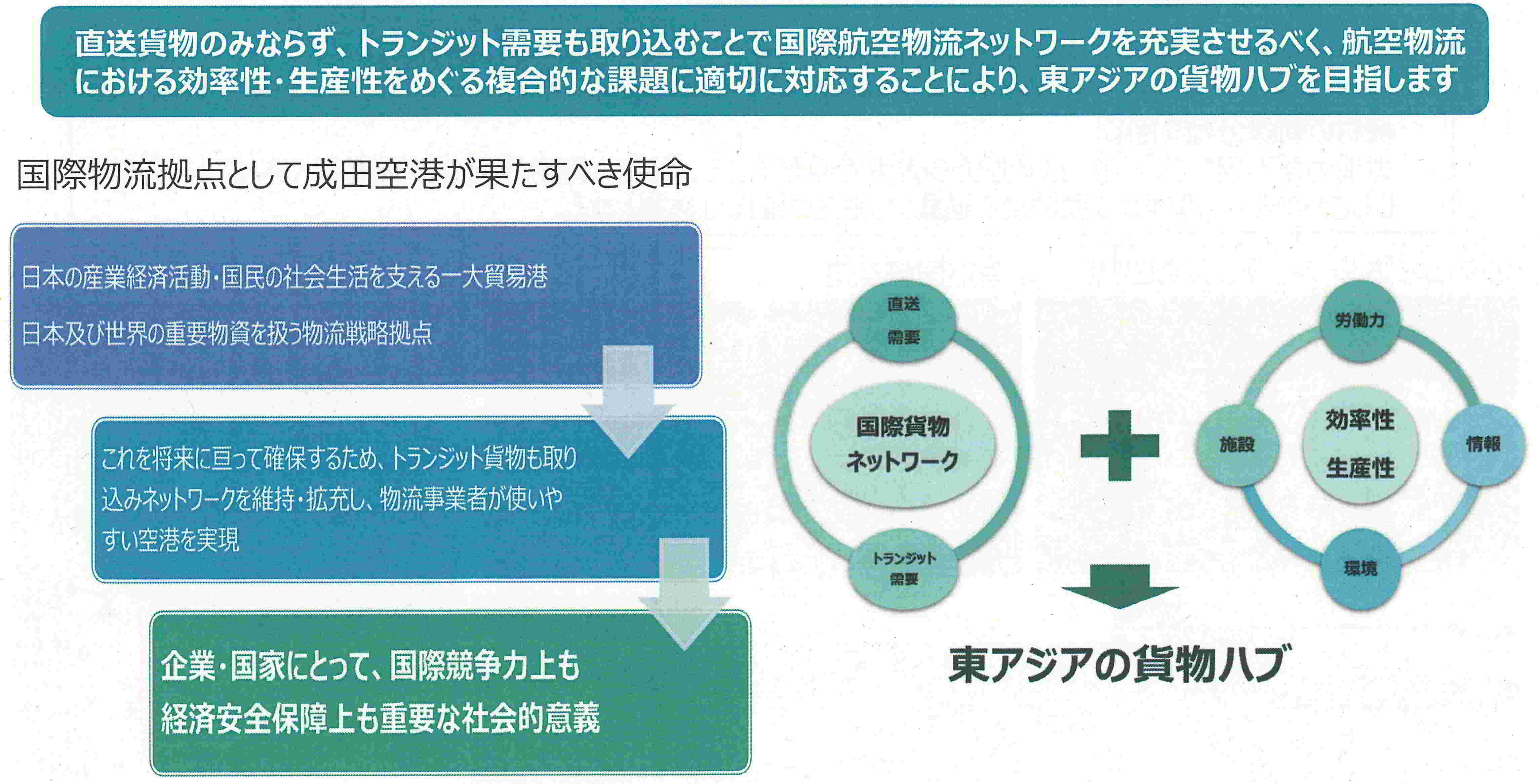 ACI空港ランキング(国際航空貨物取扱量)によると、成田空港は1989年に首位だったが、新興空港の発展により、2024年には10位に後退した。羽田空港を合わせた「首都圏空港」としても3位の仁川国際空港(韓国)に及ばないことから、日本の貿易を支えていくためにはトランジット貨物を取り扱いやすい施設への転換を含め、成田空港の機能強化が必須となっている。