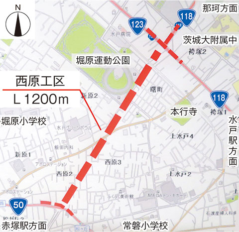 同工区の現状では、国道50号と那珂方面を結ぶ経路が複雑であるほか、現道の幅員が狭いなどの課題がある。