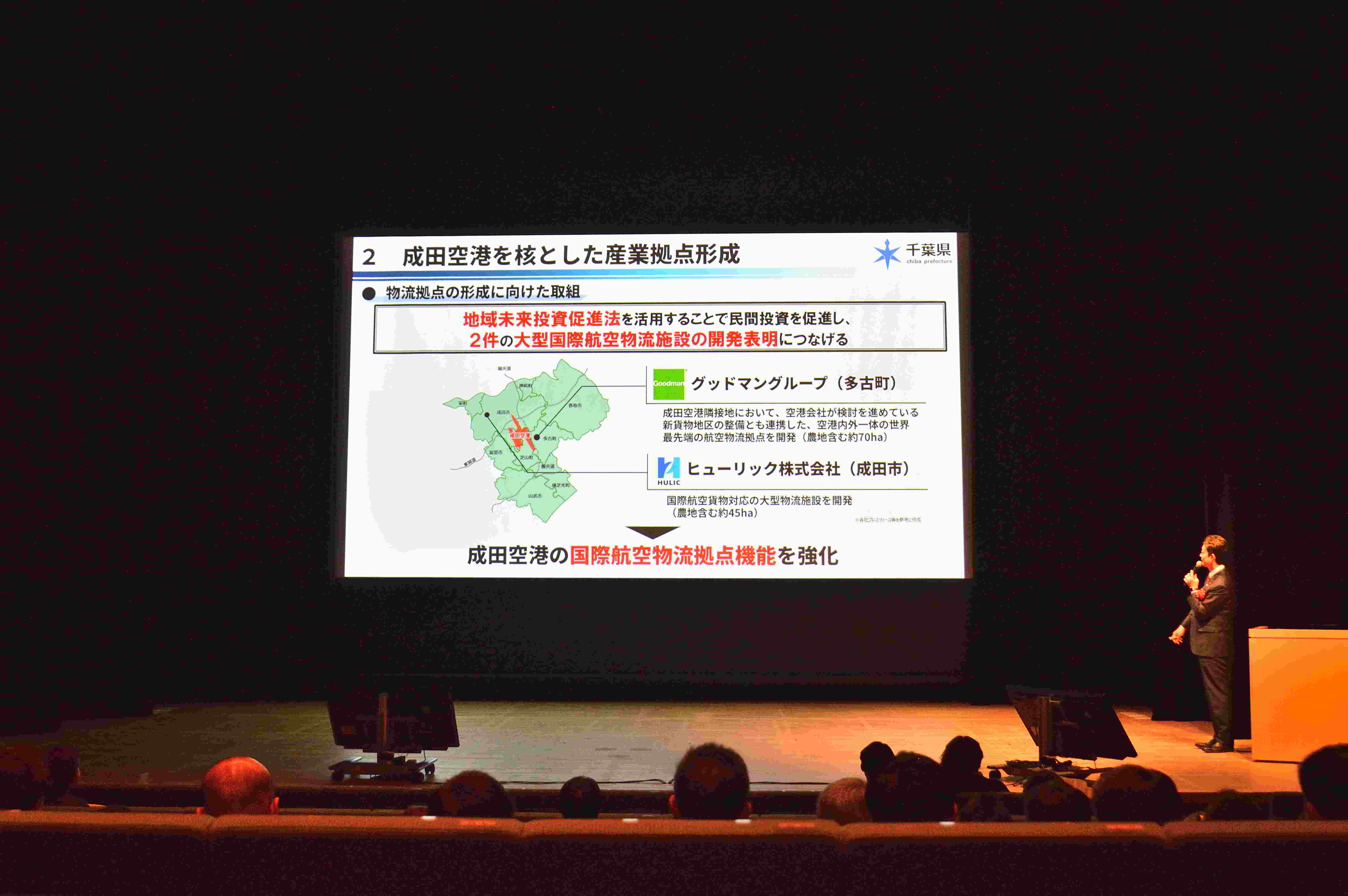 熊谷知事は、成田空港を核とした産業拠点形成に関して「空港を生かし、物流、精密機器、航空宇宙といった産業を誘致していく。国際物流拠点については、グッドマングループとヒューリックによる2つの大きなプロジェクトが動き出している。さらに、空港と特に親和性の高い航空宇宙関連産業の集積を目指している」と強調。