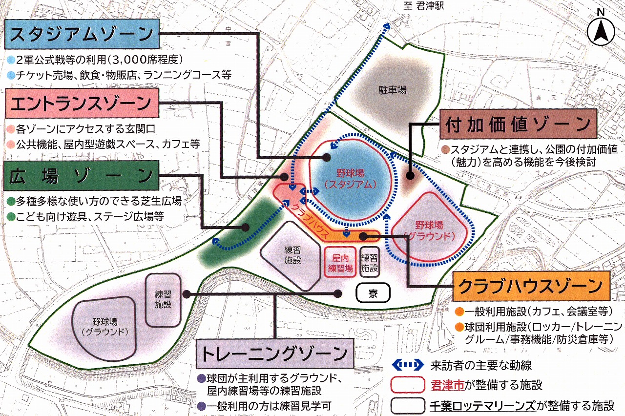 君津市は、「千葉ロッテマリーンズ(球団)ファーム本拠地移転プロジェクト」において野球場を中心としたボールパークに位置付けている(仮称)貞元総合公園の整備方針などを明らかにした。整備方針では、園内をスタジアムゾーン、エントランスゾーン、広場ゾーン、クラブハウスゾーン、トレーニングゾーン、付加価値ゾーンに区分。スタジアムゾーンは、2軍公式戦で利用可能な3000席程度の野球場に、チケット売り場、飲食売店、物販店舗を併設し、野球場外周に散策路やランニングコースを設置する。