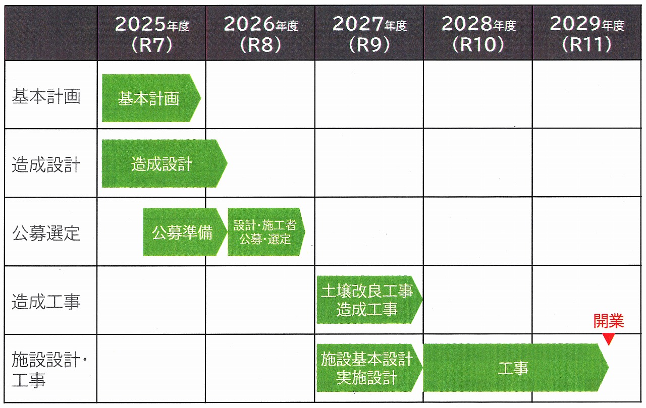 年度内に基本計画をまとめ、2026年6月に整備事業者の公募を開始し、同年度内の選定を予定。27年度に施設の基本設計と実施設計、土壌改良工事、造成工事、28年度に施設工事を実施し、29年度の開業を目指す。