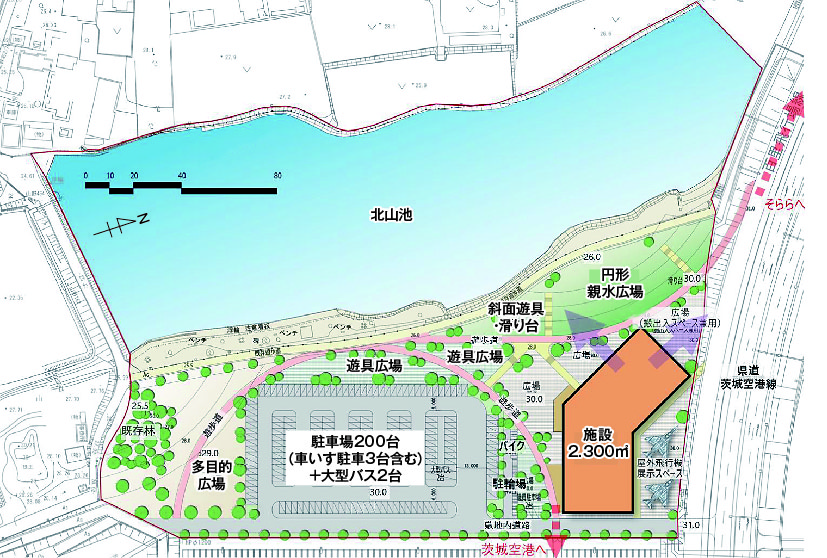 新交流拠点施設は、茨城空港駐車場に隣接する空港公園内の北山池周辺に整備する計画。建物は平屋建てで、延べ床面積は約2300㎡を想定している。