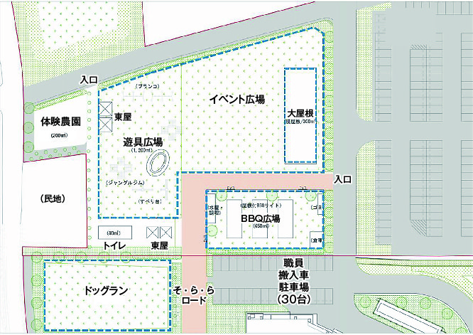 拡張エリアには、屋根付きのイベント広場(1900㎡)や遊具広場(1200㎡)、BBQ広場(650㎡)、体験農園(200㎡)、ドッグラン(1500㎡)、駐車場を整備する。