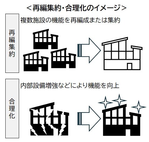 『再編集約』は複数施設の機能を再編成または集約する。『合理化』は一つの施設について、内部設備増強などにより機能を向上させる。これらにより管理・運営・利用を効率化するもの。施設の新設、移設、増築、改修(耐震化含む)などを行う取り組みに対しては、都道府県が取り組みの支援を行う場合、その費用の一部を国が支援する。解体、撤去、廃棄、整地も支援対象となる。