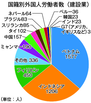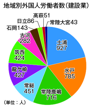 建設業での国籍別外国人労働者はベトナムが1577人で最も多い。次いでインドネシア1206人、フィリピン450人と続く。ハローワーク地域別では、土浦管内927人、水戸管内785人、常陸鹿嶋管内716人、常総管内451人、龍ケ崎管内427人、筑西管内425人の順番。