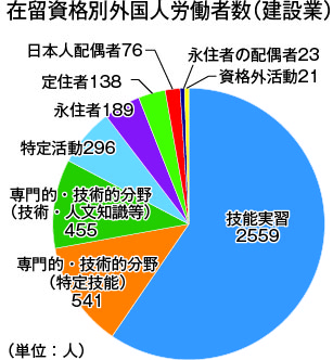 在留資格別では技能実習が2559人で全体の6割を占める。次いで専門的・技術分野のうち特定技能が541人、専門的・技術分野のうち技術・人文知識・国際業務等が455人で続く。