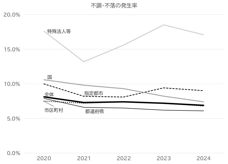 20年度からの5年間における不調・不落の発生率は、国が20年度10・6%、21年度9・8%、22年度9・3%、23年度8・2%、24年度7・4%と着実に減少している。都道府県は20年度7・9%、21年度6・6%、22年度6・5%、23年度6・2%、24年度6・1%で減少傾向。市区町村は20年度7・5%、21年度7・2%、22年度7・4%、23年度7・2%、24年度6・8%と下がっている。