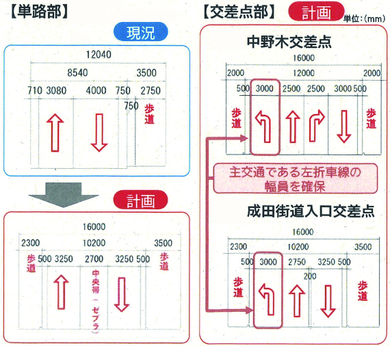 中野木交差点は、主交通となっている左折車線の幅員を確保することとし、歩道2m、路肩0・5m、車線(千葉方向)3m、右折車線2・5m、車線(市川方向)2・5m、左折車線3m、路肩0・5m、歩道2mに整備。