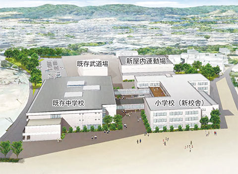 今後は基本構想策定後、用地取得等の状況を見つつ26年度の補正予算で設計費を計上したい考え。27年度までに設計をまとめ、28年度から約28カ月の工期で新校舎建設工事を進める。29年度からは学童クラブやバスロータリー、グラウンド整備等を進め、31年4月の開校を目指す。新施設の供用開始に合わせ、既存の中学校体育館は解体する。