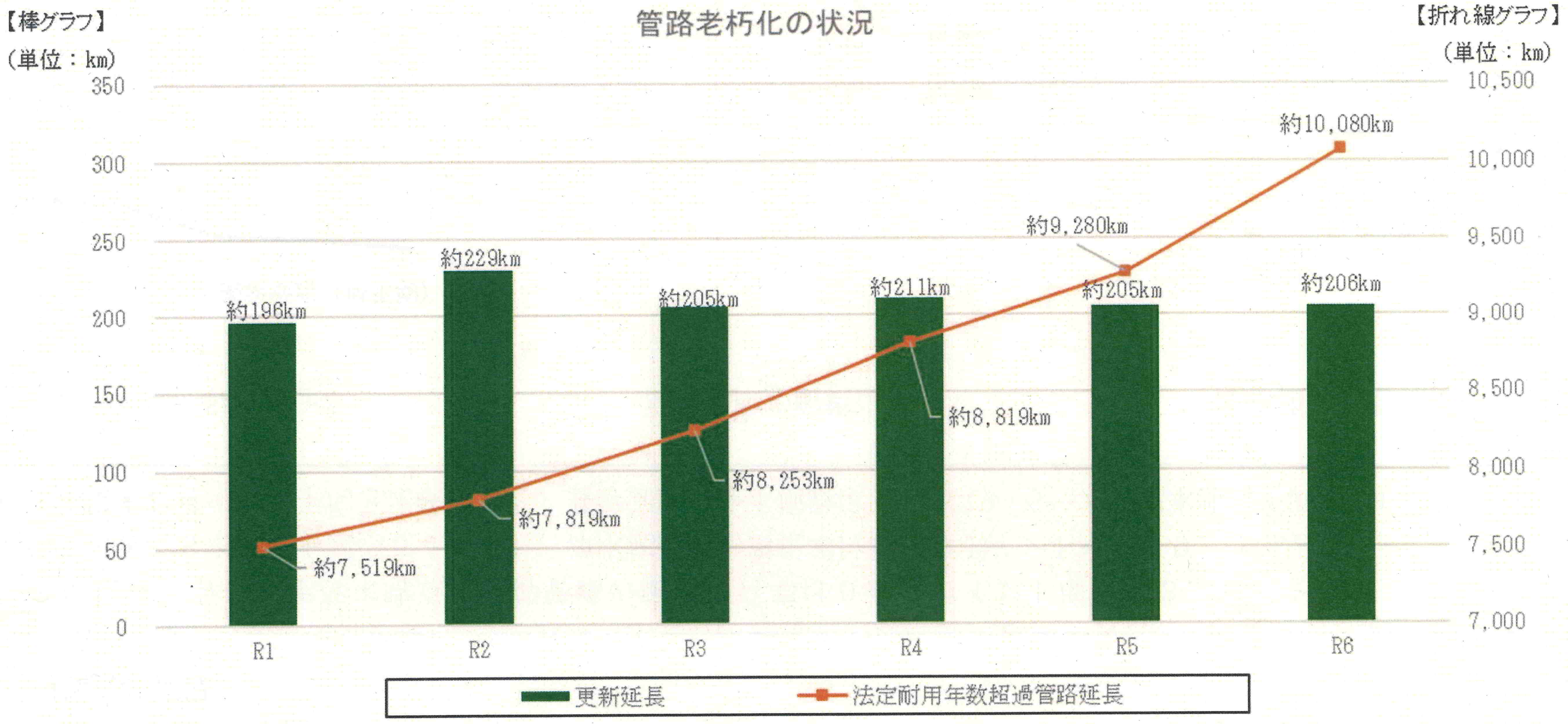 ▽湾岸埋め立て地域の管路更新延長=18km/年▽最重要給水施設管路の更新延長=12・5km/5年