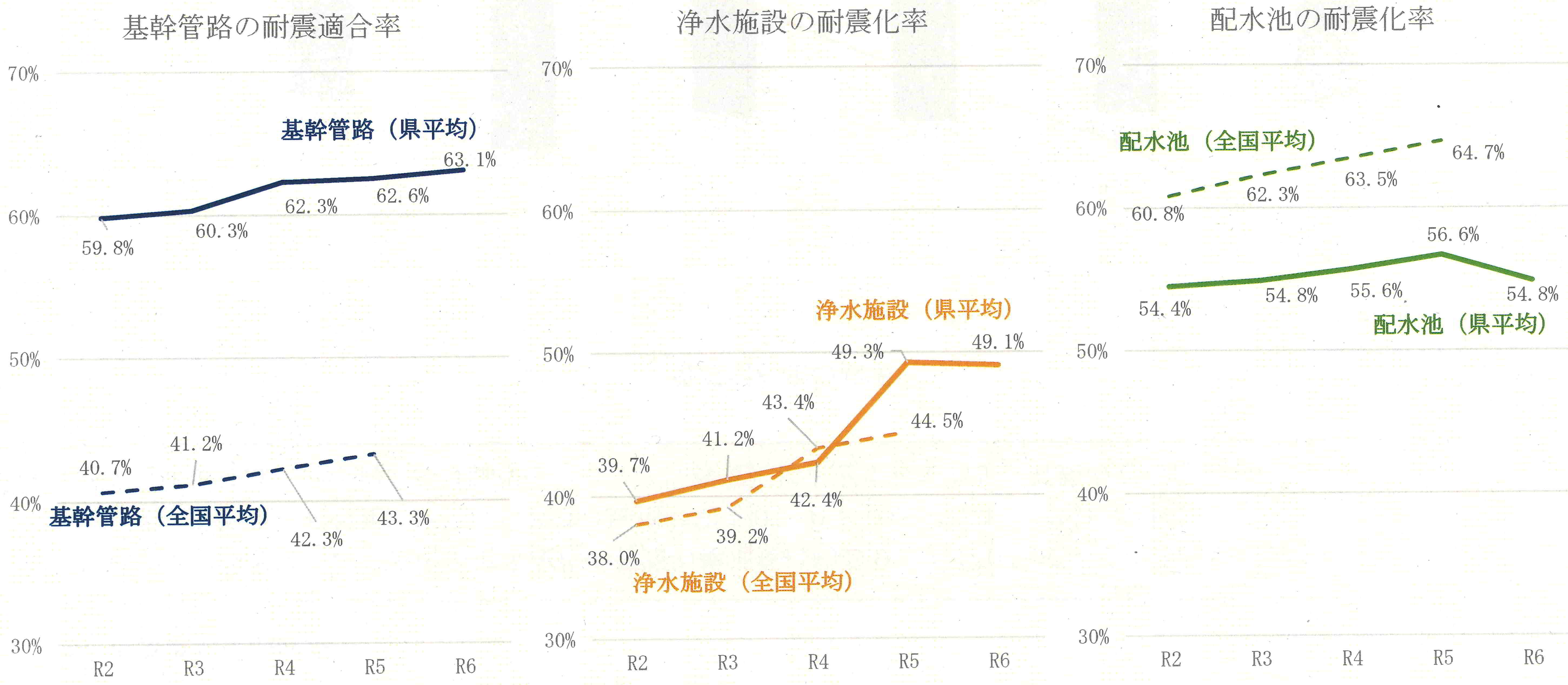 基幹管路の耐震適合率は、前年度比0・5ポイント増の63・1%。一方で、配水池の耐震化率は1・8ポイント減の54・8%、浄水施設の耐震化率は0・2ポイント減の49・1%となった。