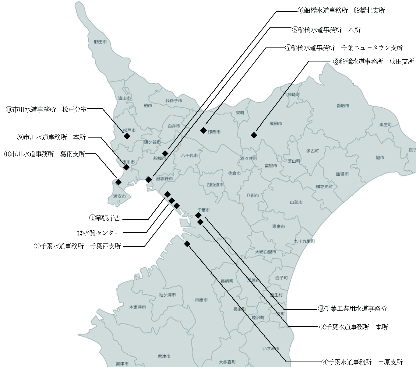 あり方を検討する庁舎は、千葉水道事務所の千葉西支所・市原支所、船橋水道事務所の本所・船橋北支所・千葉ニュータウン支所・成田支所、市川水道事務所の本所・松戸分室・葛南支所。30年度まで検討を進め、31年度以降、検討を踏まえた対応を図る。